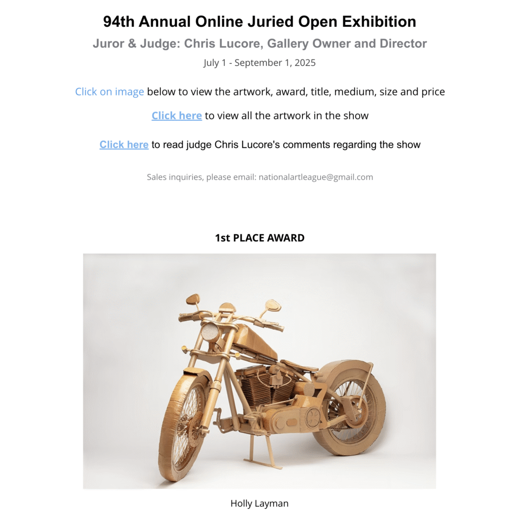 Exciting News! The Proper Chopper Bobber was accepted and won First place in the National Art League 94th Annual Online Juried Open Exhibition. There were many deserving artists and I am honored to have been selected. You can view the online show here. https://www.nationalartleague.org/