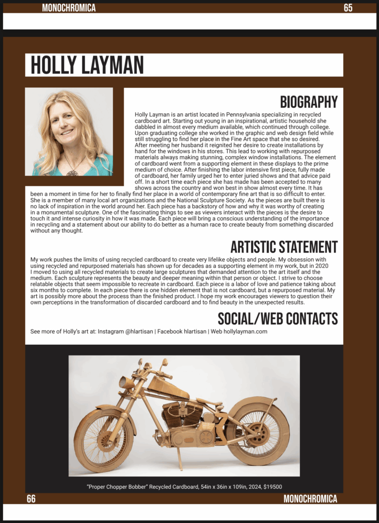 Red Cloud and the Proper Chopper Bobber have been accepted into the December issue of Monochromatica – 006. This issue focuses on the color brown so I thought it to be fitting to enter my cardboard pieces that are inherently brown tones. This issue has released and it is a wonderfully and professionaly published magazine. It is available for free to view online and for a small fee in print.